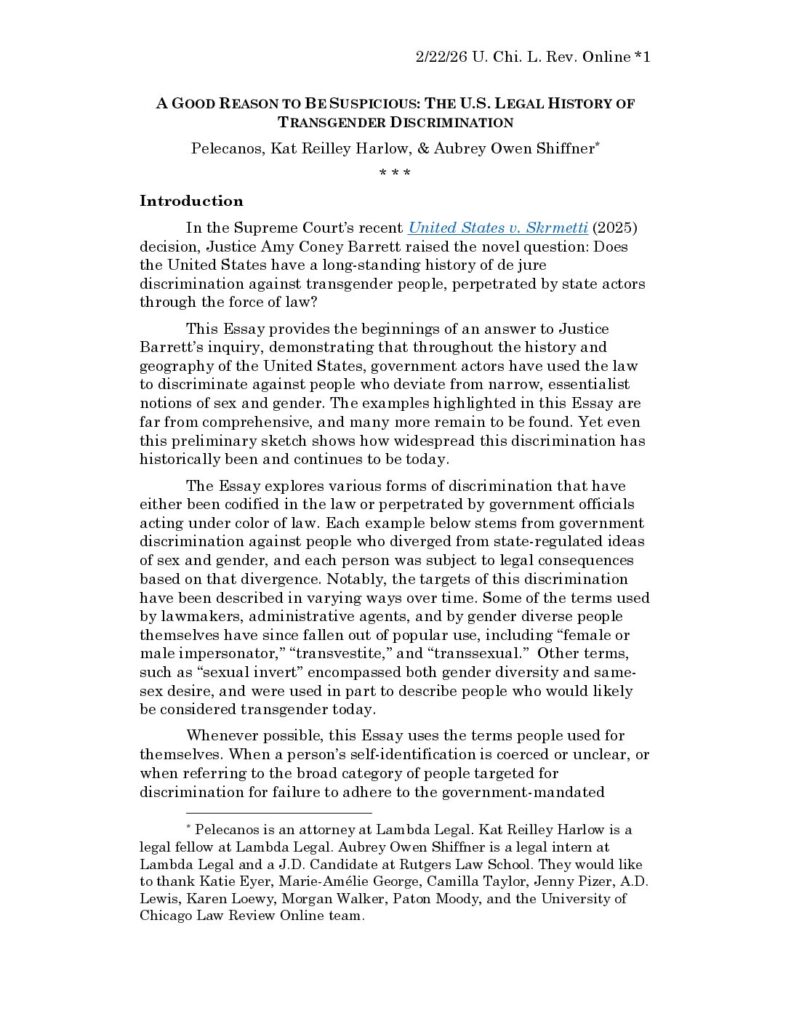 “In the Supreme Court’s recent United States v. Skrmetti (2025) decision, Justice Amy Coney Barrett raised the novel question: Does the United States have a long-standing history of de jure discrimination against transgender people, perpetrated by state actors through the force of law? This Essay provides the beginnings of an answer to Justice Barrett’s inquiry, demonstrating that throughout the…