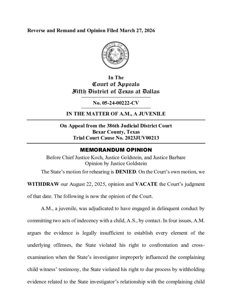 The Fifth Court of Appeals of Texas reversed a sex offense adjudication finding a violation of due process and the right to confrontation when a state investigator signaled to a child witness during their testimony at trial. The court stated in relevant part: “Rather than being a permissible support person, Dear, looking like Santa, interjected…