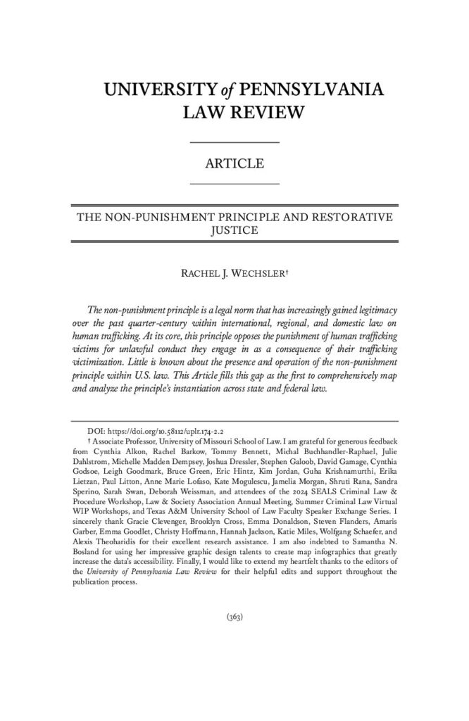 “The non-punishment principle is a legal norm that has increasingly gained legitimacy over the past quarter-century within international, regional, and domestic law on human trafficking. At its core, this principle opposes the punishment of human trafficking victims for unlawful conduct they engage in as a consequence of their trafficking victimization. Little is known about the…