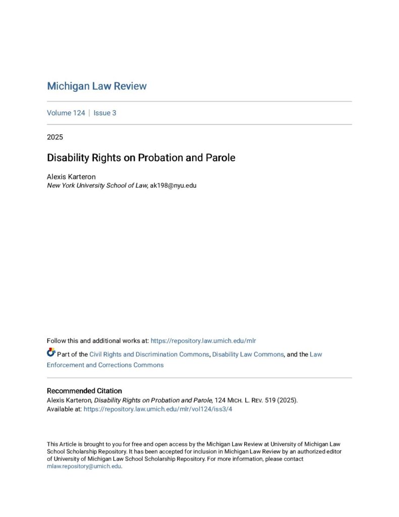 This article focuses on the policies and practices of community supervision programs, and the impact they have on individuals with disabilities, including discriminatory practices that prevent disabled individuals from successfully completing probation or parole. From the introduction: ” This Article addresses disability discrimination in community supervision programs, a large—but frequently overlooked—component of the criminal legal…