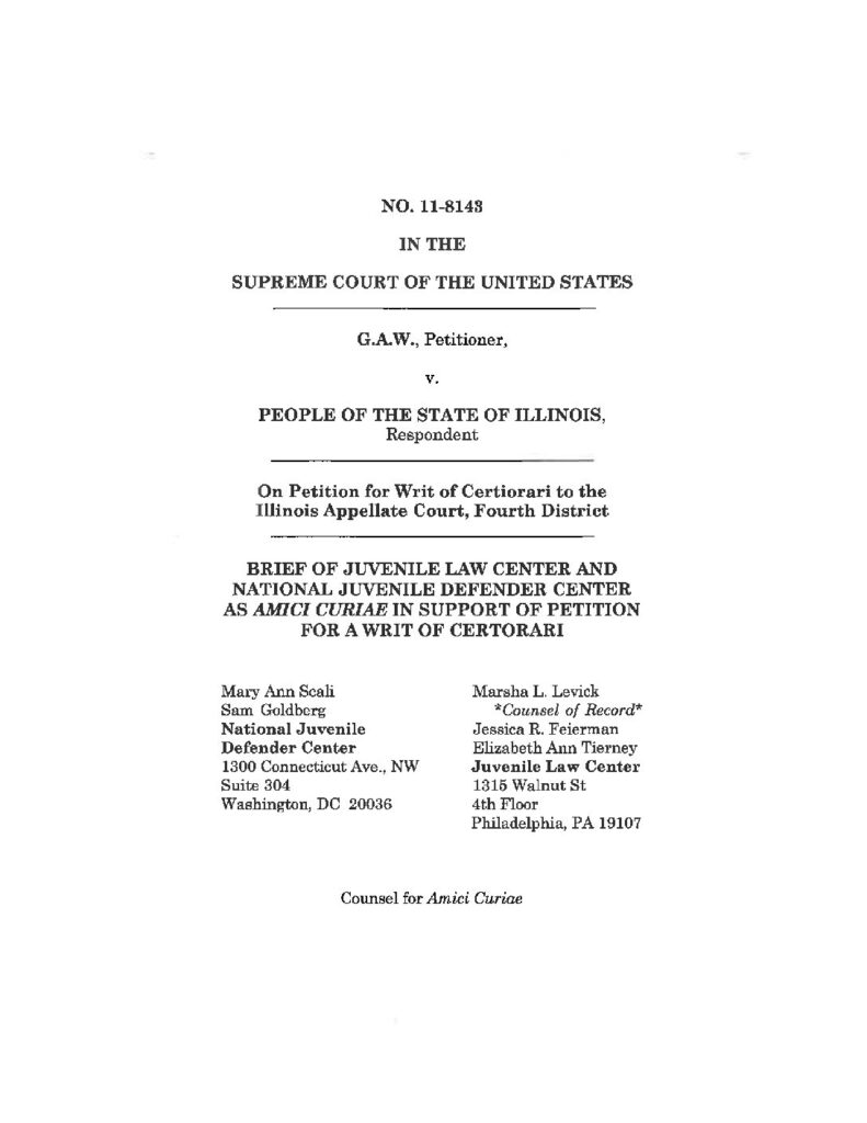 This amicus brief by Juvenile Law Center and The Gault Center argues Illinois automatic transfer law does not comply with recent research and findings on adolescent development as recognized by the Supreme Court jurisprudence in Roper and Graham. Further, amici argue the state’s automatic transfer statute violates the proportionality clause of Article I, Section 11…