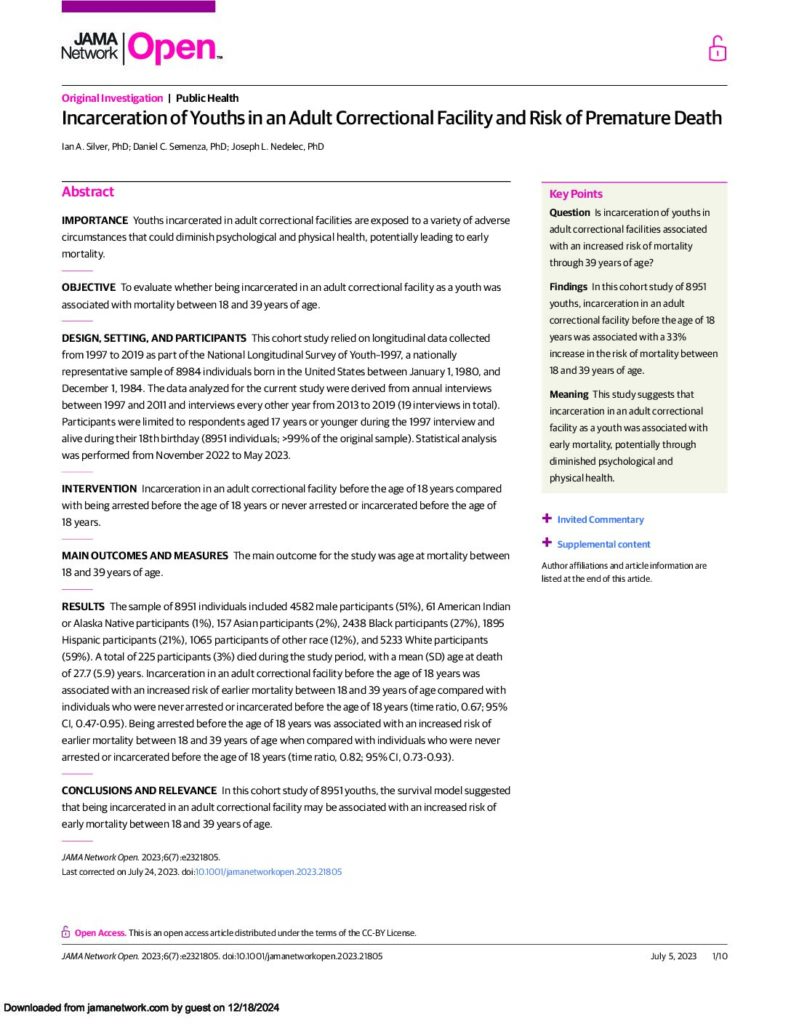 Youths incarcerated in adult correctional facilities are exposed to a variety of adverse circumstances that could diminish psychological and physical health, potentially leading to early mortality. In this cohort study of 8951 youths, the survival model suggested that being incarcerated in an adult correctional facility may be associated with an increased risk of early mortality…