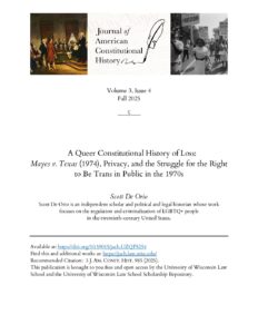 “In the period of the 1960s through 2015, the U.S. Supreme Court issued a set of canonical, key decisions expanding the constitutional doctrines of sexual liberty and privacy, equality, and substantive due process for women and sexual and gender minorities. The Court interpreted these principles to protect contraceptive use, abortion, interracial marriage, the private consumption of pornography, the old common-law crime of sodomy, and marriage between people of the same sex. This article argues for the importance in the constitutional history of sexual and gender regulation not only of cases that the Supreme Court decided in favor of the women and sexual/gender minority litigants, but also the importance of cases these litigants lost, and even ones the Court declined to hear. One such case was Mayes v. Texas (1974), in which the U.S. Supreme Court denied certiorari in a challenge to the constitutionality of the city of Houston’s criminal law against crossdressing. A close examination of the Mayes case illuminates important aspects of queer constitutional history and the history of grassroots efforts to expand privacy and substantive due process doctrine. First, it reveals one of the ways in which trans people were subject to formal, legal discrimination in the past (laws against crossdressing), and, in the Court’s refusal to hear the case, demonstrates the high bar trans litigants had to overcome to adjudicate their rights. This is especially important because the Supreme Court has recently denied that any such discrimination has ever existed. Second, Mayes v. Texas shows the boundaries of the Supreme Court’s privacy and substantive due process doctrine. The Justices’ decision to decline certiorari was not just a loss for trans-rights activists. It also meant that the right to privacy never extended to transgender expression. Finally, the article illuminates trans activism at the local and state levels as an important venue of legal contestation and constitutional claims-making.”