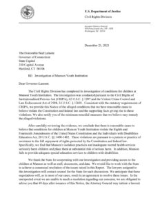 On December 21, 2021, the DOJ released its investigation of the Connecticut Manson Youth Institution, finding that the conditions violate young people’s rights under the Eighth and Fourteenth Amendments and the Individuals with Disabilities Education Act. In its Investigation, the DOJ stated “specifically, we find that Manson’s isolation practices and inadequate mental health services seriously harm children and place them at substantial risk of serious harm. In addition, Manson fails to provide adequate special education services to children with disabilities.”