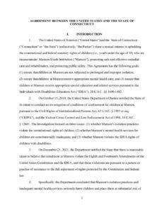 On August 29, 2024, the DOJ and the Connecticut Department of Correction entered into a settlement agreement with the following goals: “(1) ensure that children at Manson are not subjected to prolonged and improper isolation; (2) ensure that children at Manson receive appropriate mental health care; and (3) ensure that children at Manson receive appropriate special education and related services pursuant to the Individuals with Disabilities Education Act (“IDEA”), 20 U.S.C. §§ 1400-1482.”