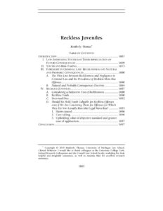 From the Abstract: “Modern doctrine and scholarship largely take it for granted that offenders should be criminally punished for reckless acts. Yet, developments in our understanding of human behavior can shed light on how we define and attribute criminal liability, or at least force us to grapple with the categories that have existed for so long. This Article examines recklessness and related doctrines in light of the shifts in understanding of adolescent behavior and its biological roots, to see what insights we might attain, or what challenges these understandings pose to this foundational mens rea doctrine. Over the past decade, the U.S. Supreme Court has concluded that youth are categorically different for purposes of criminal sentencing, and that these categorical differences in maturity, ability to make reasoned decisions, resist outside pressure and influences and the like lead to objective lines being drawn between youth and adults. The Court’s distinctions have drawn on a significant body of research literature, including brain imaging scans that help us understand the maturation of the human brain over the course of adolescence. This Article posits that these developments, when mapped onto existing criminal law, call into question holding youth responsible for offenses that require actual foresight of the consequences of their risky behavior. Instead, the U.S. Supreme Court’s recent analyses of the categorical differences between youth and adults in the criminal realm, as well as the science and social science research underlying these differences, wears away – for this category of individuals – the basis for holding youth in juvenile or adult court accountable for crimes of “foresight” and express disregard for risk.”
