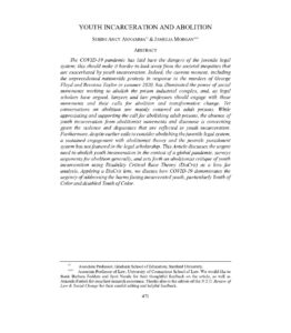 “The COVID-19 pandemic has laid bare the dangers of the juvenile legal system; this should make it harder to look away from the societal inequities that are exacerbated by youth incarceration. Indeed, the current moment, including the unprecedented nationwide protests in response to the murders of George Floyd and Breonna Taylor in summer 2020, has illuminated the power of social movements working to abolish the prison industrial complex, and, as legal scholars have argued, lawyers and law professors should engage with these movements and their calls for abolition and transformative change. Yet conversations on abolition are mainly centered on adult prisons. While appreciating and supporting the call for abolishing adult prisons, the absence of youth incarceration from abolitionist movements and discourse is concerning given the violence and disparities that are reflected in youth incarceration. Furthermore, despite earlier calls to consider abolishing the juvenile legal system, a sustained engagement with abolitionist theory and the juvenile punishment system has not featured in the legal scholarship. This Article discusses the urgent need to abolish youth incarceration in the context of a global pandemic, surveys arguments for abolition generally, and sets forth an abolitionist critique of youth incarceration using Disability Critical Race Theory (DisCrit) as a lens for analysis. Applying a DisCrit lens, we discuss how COVID-19 demonstrates the urgency of addressing the harms facing incarcerated youth, particularly Youth of Color and disabled Youth of Color. “
