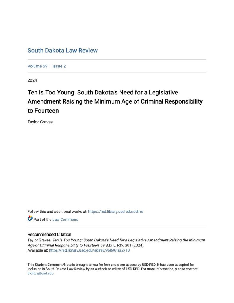From the abstract: “South Dakota, like many other states, allows young children to be introduced to the criminal justice system at a very young age. Although South Dakota originally focused on managing children’s misbehavior, the law has evolved in a way that punishes kids for being kids. Despite recent reforms to handle juvenile delinquency in…